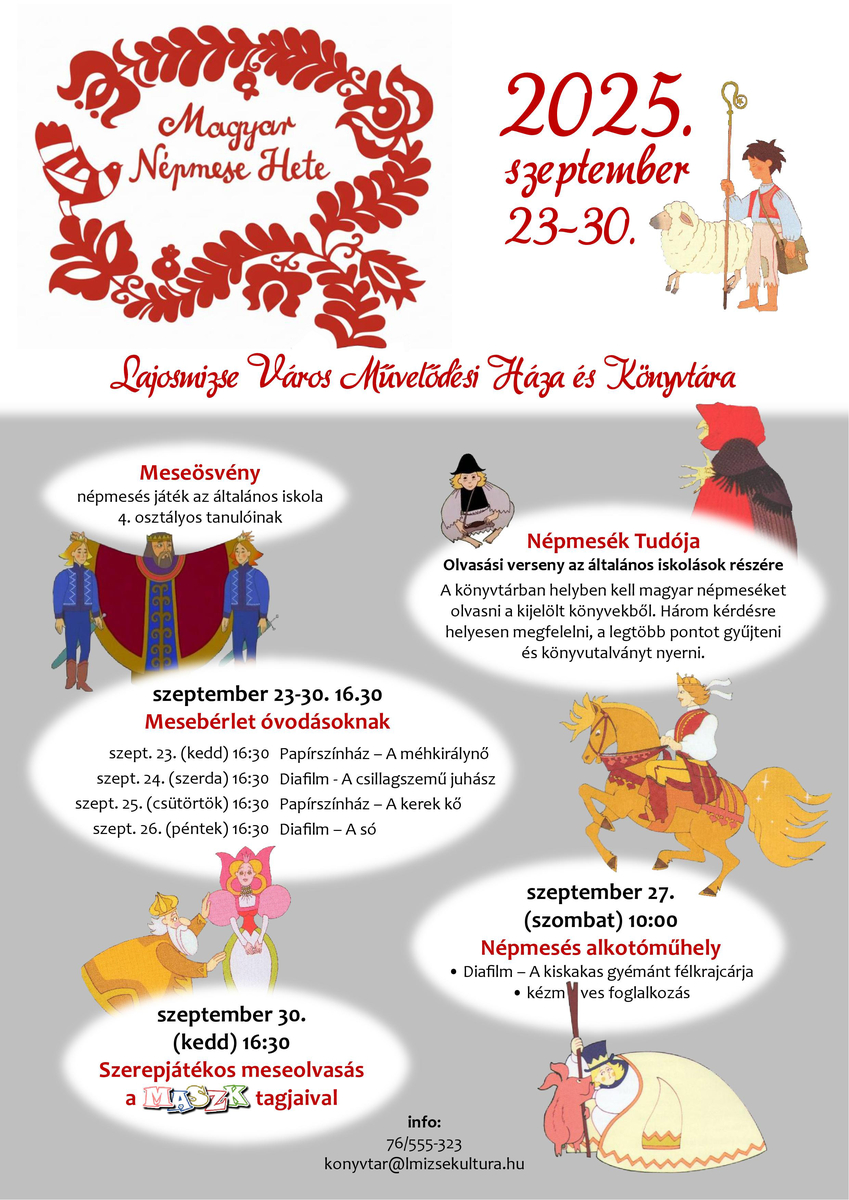 Szeptember 30-ám Benedek Elek születése napján, ismét a népmesékre figyelünk. A Cimbora Játszóház közreműködésével reggeltől délutánig tartó szellemi és ügyességi játékok, kézműves foglalkozások tarkítják a napot. Iskolaidőben szervezetten, délután pedig minden érdeklődőt várunk a könyvtár és művelődési ház tereibe!