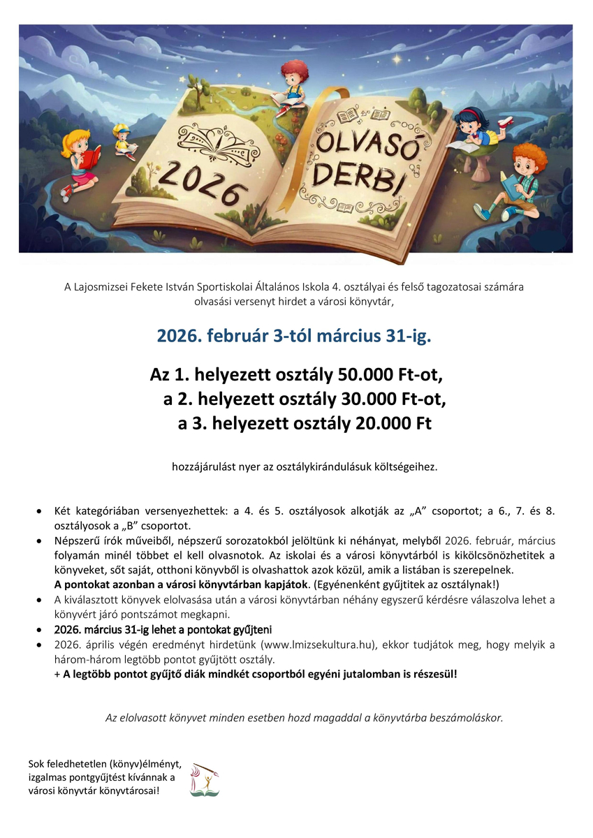 A Fekete István Általános Iskola osztályai számára olvasási versenyt hirdet a városi könyvtár és a Lajosmizsei Kultúrapártoló Alapítvány